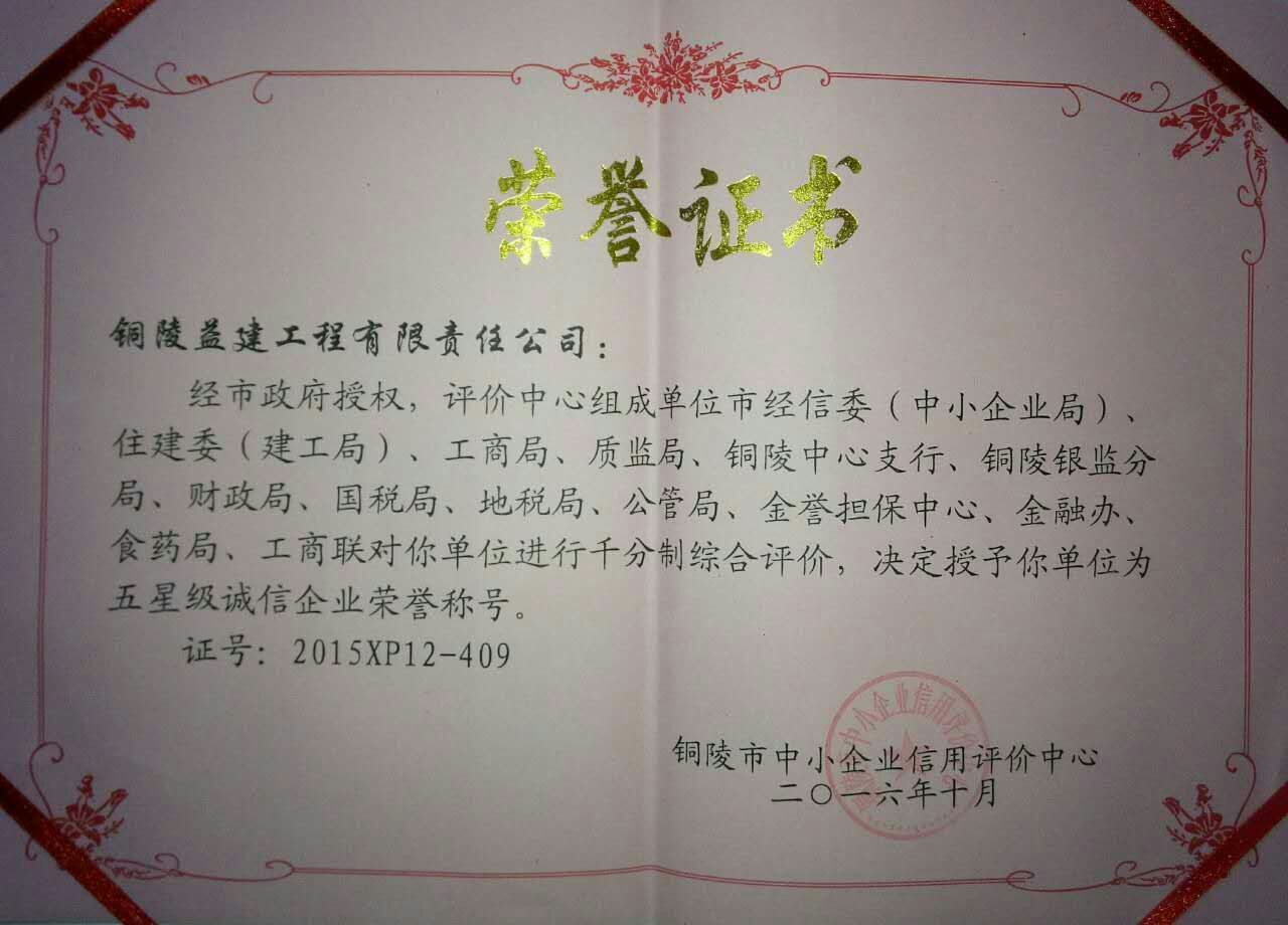 2015年度“五星級(jí)誠(chéng)信企業(yè)”榮譽(yù)稱號(hào)。