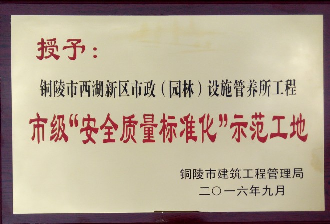 益建公司承建的西湖新區(qū)市政(園林)設(shè)施管養(yǎng)所工程榮獲銅陵市2016年度“市級(jí)建筑施工安全質(zhì)量標(biāo)準(zhǔn)化示范工地”榮譽(yù)稱號(hào)。