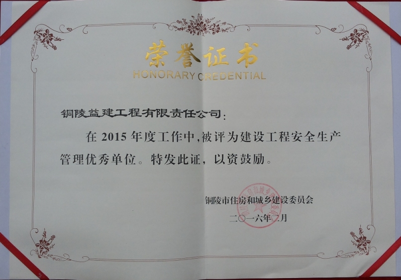 授予銅陵益建工程有限責任公司2015年度“建設(shè)工程安全生產(chǎn)管理優(yōu)秀單位”榮譽稱號。