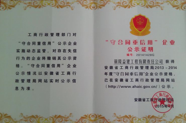 2015年4月30日,安徽省工商行政管理局公布了2013-2014年度省級“守合同重信用企業(yè)”名單,銅陵益建公司光榮上榜。
