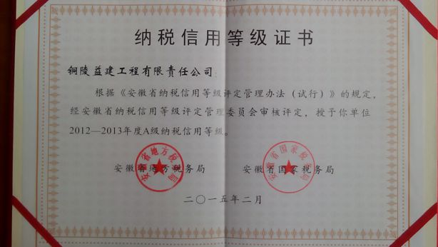 日前,安徽省地稅局、安徽省國(guó)稅局公布了2012—2013年度A級(jí)納稅信用單位評(píng)定結(jié)果,銅陵益建公司被評(píng)定為“A級(jí)納稅信用單位”。榮獲“A級(jí)納稅信用單位”榮譽(yù)稱號(hào)是國(guó)家稅務(wù)機(jī)關(guān)對(duì)納稅人依法納稅、誠(chéng)信納稅工作的高度肯定和認(rèn)可。