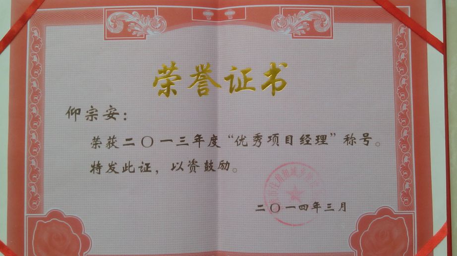授予銅陵益建工程有限責(zé)任公司項目經(jīng)理仰宗安同志為2013年度“優(yōu) 秀項目經(jīng)理”榮譽稱號。