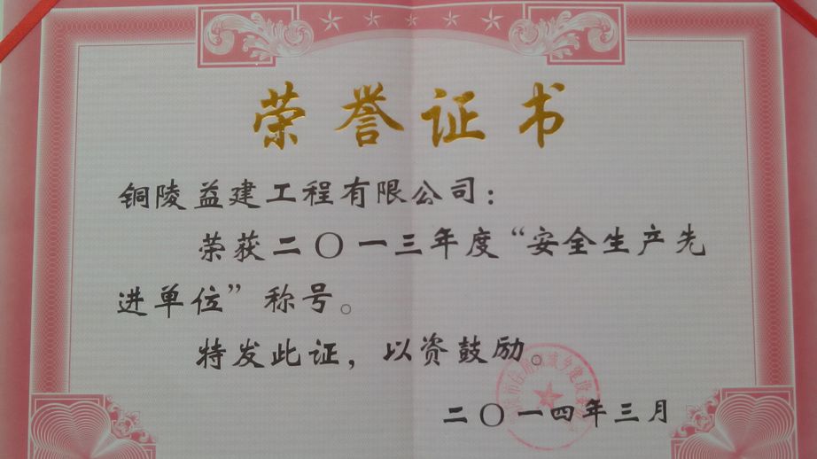 授予銅陵益建工程有限責(zé)任公司2013年度“安全生產(chǎn)先進單位”榮譽稱號。