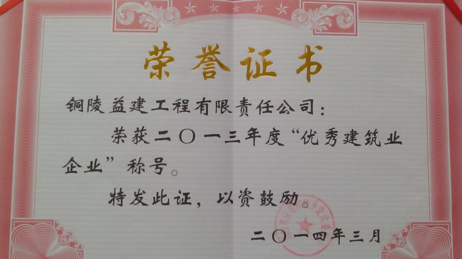 授予銅陵益建工程有限責(zé)任公司2013年度“優(yōu) 秀建筑企業(yè)”榮譽稱號。